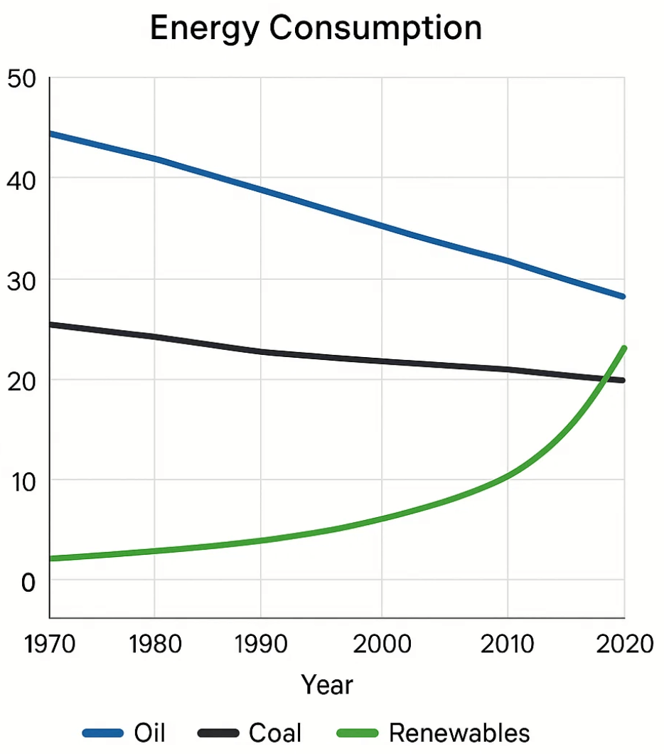 The line graph shows changes in energy consumption from three major sources—oil, coal, and renewables—over a fifty-year period.