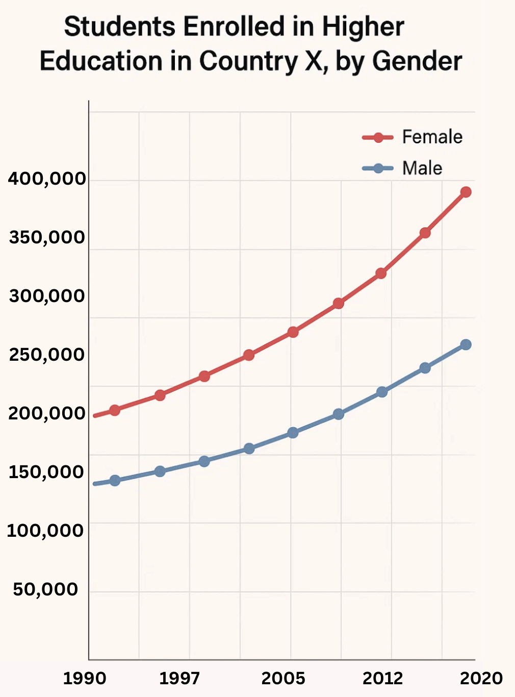Task: The line graph shows the number of students enrolled in higher education in Country X by gender between 1990 and 2020.