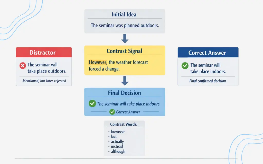 The options often look very close in meaning. You may hear information connected to all three choices. However, only one reflects the speaker’s final, confirmed idea.