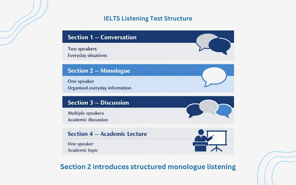 IELTS Listening Section 2 is often underestimated. It is not academic like Section 4, and it does not involve a discussion like Section 3. Instead, it features a single speaker in a real-life context. Because it is a monologue listening IELTS task, there is no helpful repetition or clarification from another speaker.