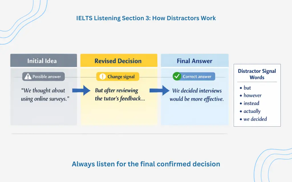 Distractors in IELTS Listening Section 3 are often logical alternatives rather than obvious corrections.