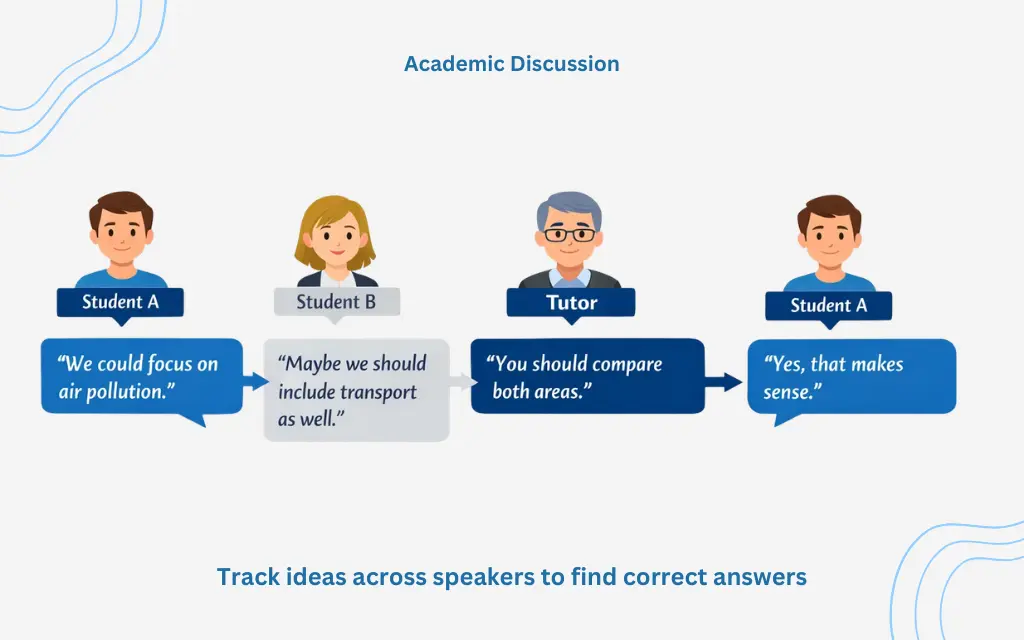 Unlike Section 2, this is not a monologue. Multiple speakers interact. They interrupt, agree, disagree, clarify, and revise their ideas. The challenge is not vocabulary alone. It is tracking ideas across different speakers.